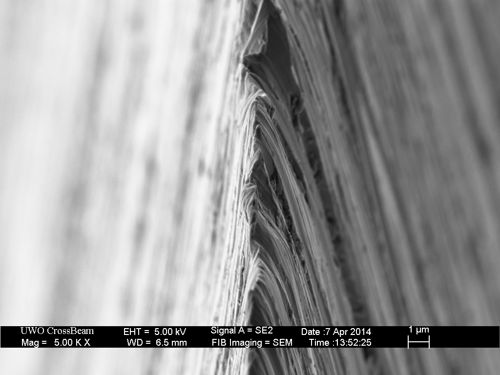 The curvature of the scratches near the apex indicates that the superior keenness of the DMT edge is result of convexity near the apex; however, this effect cannot be quantified from the edge-view SEM image alone. To visualize the edge profile and determine the extent of convexity, a cross-section of the edge is required. Focused Ion Beam (FIB) cross-sections were milled through each of the blades above, and the cross-section images are shown below.