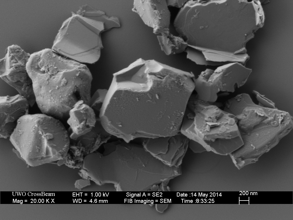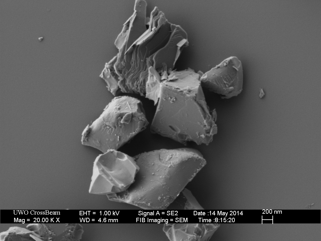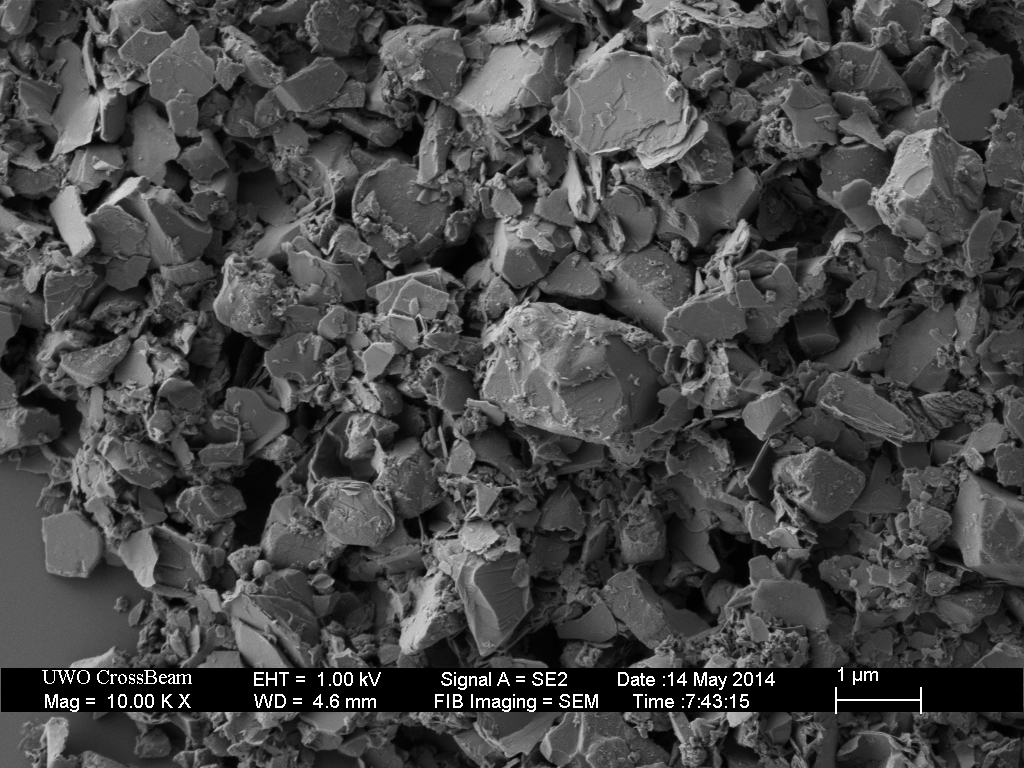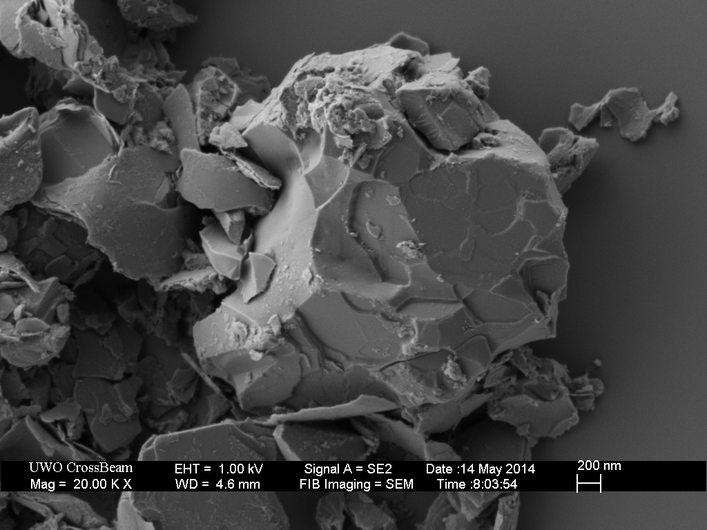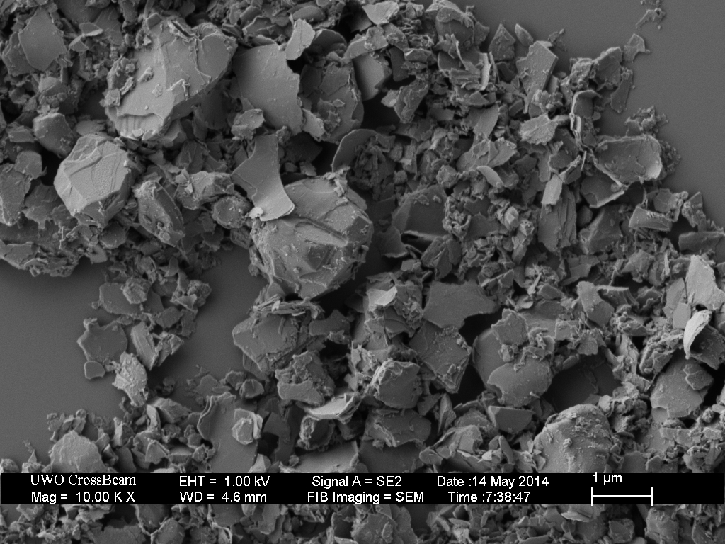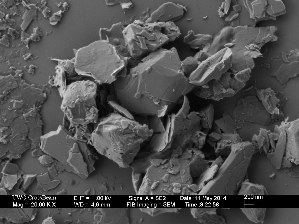 The image and corresponding data confirm that the abrasive component is silica, and that there are several morphologies (shapes) of silica particles. High resolution imaging of the various silicate particles reveals that they are Phyllosilicates (from Greek φύλλον phyllon, leaf, or sheet silicates) e.g. Mica and clay.