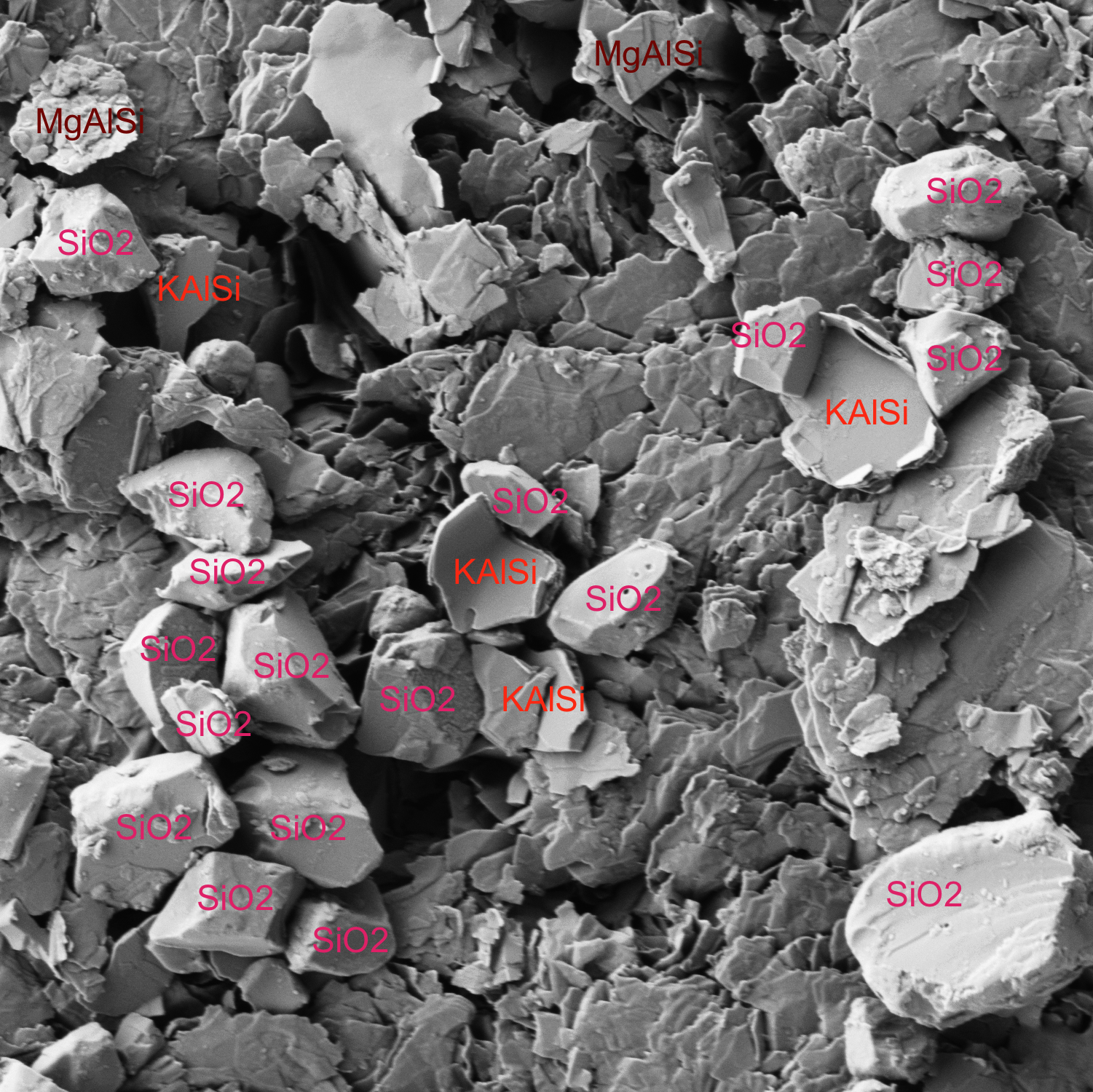 The data show 3 predominant types of particles; Silicon Oxide (silica or quartz) and two types of silicates; Potassium Aluminum Silicate, Magnesium Aluminum Silicate. A small number of Iron-containing silicates and iron oxide are also visible. A part of the above image is annotated, below, showing various particle identities.