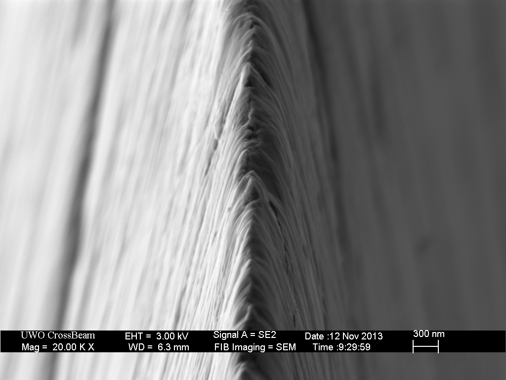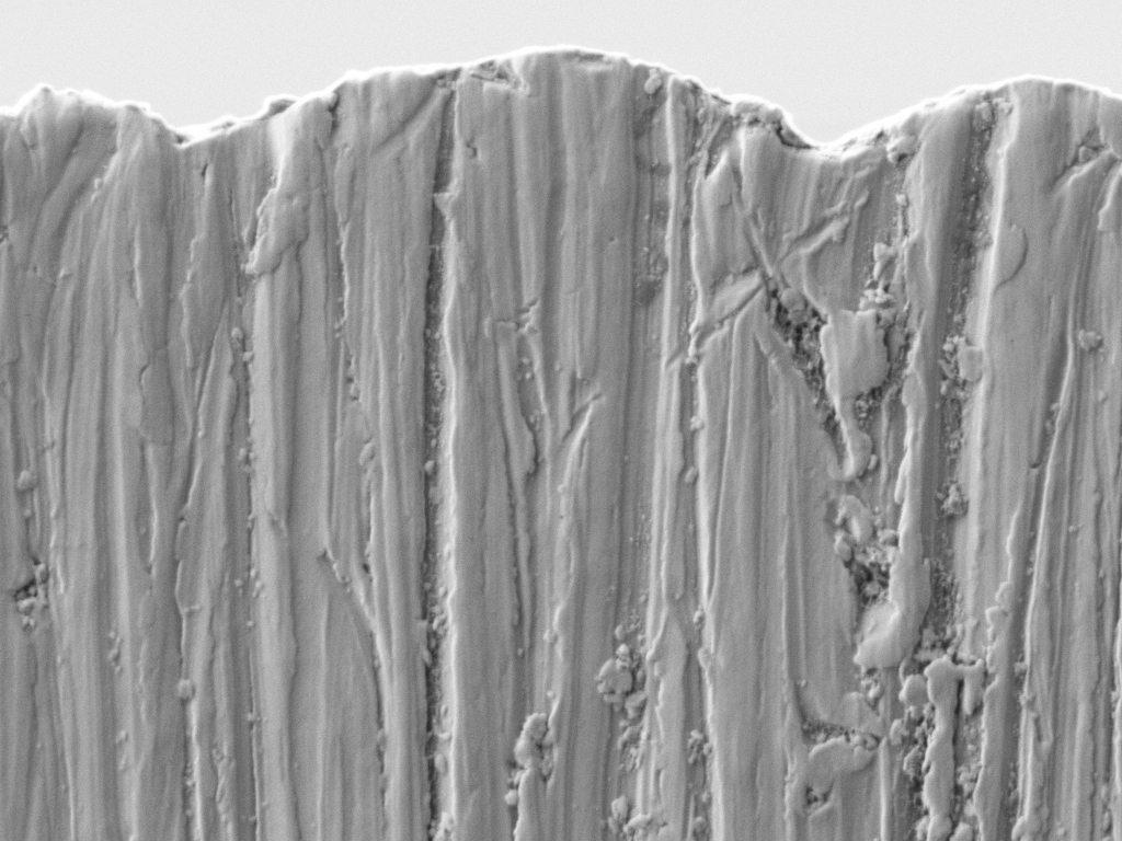 For SEM imaging, this coating blocks the view of the metal edge and I normally remove it prior to imaging stropped edges (as, for example, in the images above). It is, in fact, extremely difficult to remove. (In an optical microscope, these coating is transparent, although they may impart color due to interference effects). The effectiveness of this coating in lubricating the passage of the blade and thereby reducing the force-to-cut is yet to be determined.