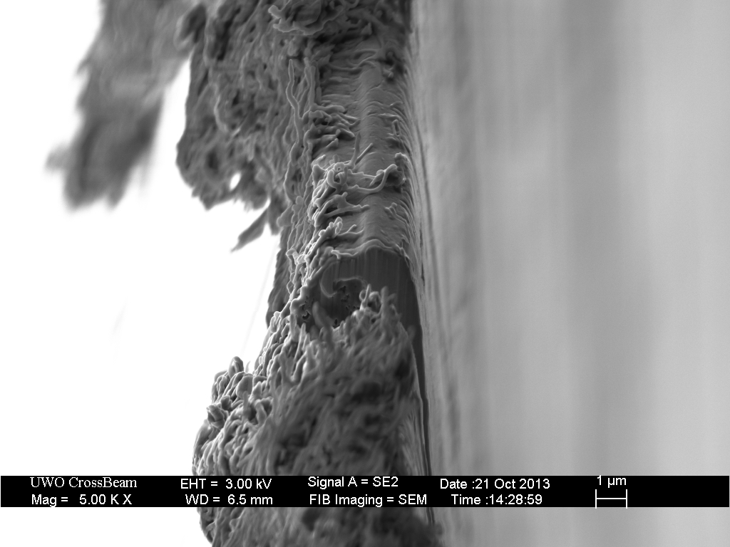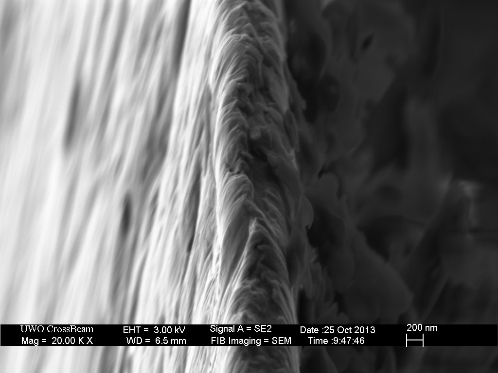 Razor edge “dulled” by drawing across the lip of a glass beaker. FIB cross-section exposes the profile of the edge.