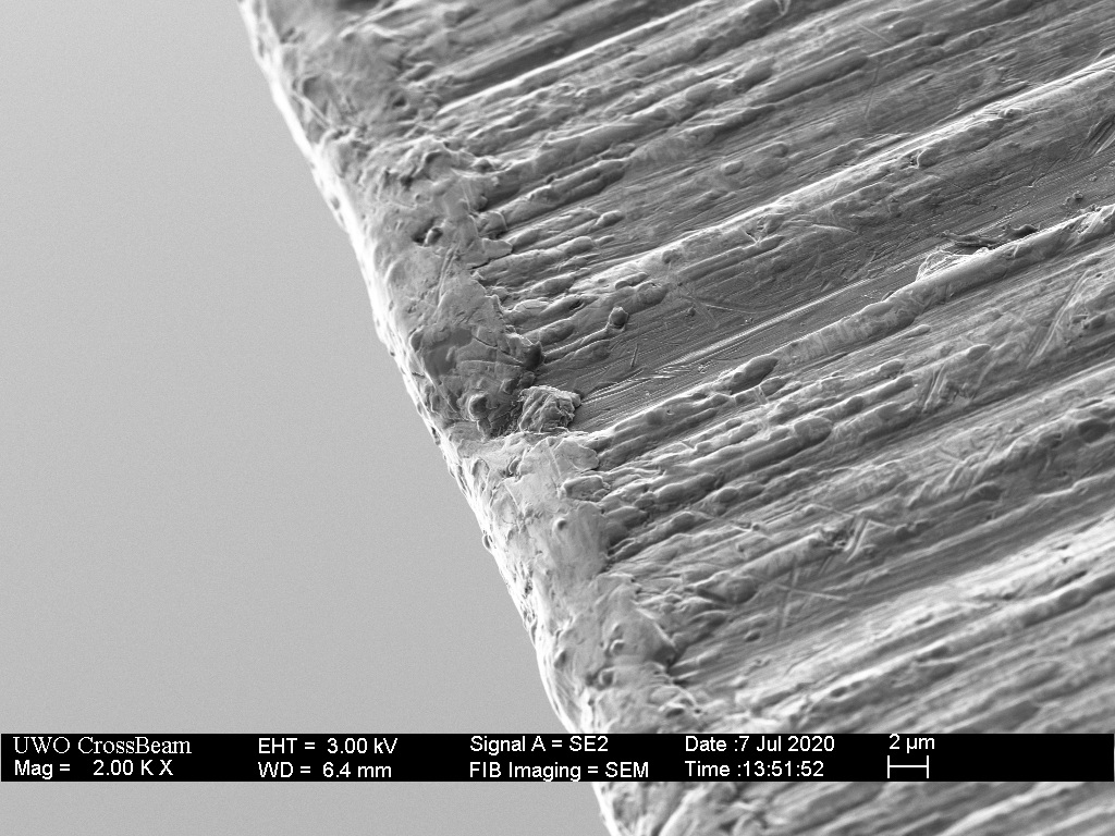 Initial observations suggest that the blade maintains micron-scale texture as the apex breaks away at micron scale (micro-chipping). The resulting edge is strikingly similar to that observed with ceramic knives. This micro-textured flat-edge with keen shoulders provides good slicing aggression, although dull by any edge width standard. In the most worn areas, those shoulders round off with micron-scale blunting by plastic deformation. It does not appear that the longer term edge retention can be directly attributed to superior wear resistance, but rather the to the micro-chipping mechanism by which dulling occurs.